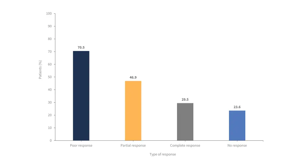 Currently, hydroxyurea (HU) is the most used cytoreductive therapy, but it is associated with poor responses and toxicity in a significant proportion of patients. Moreover, the predictors of a complete response (CR) with HU and its prognostic implications are yet to be defined.1 The impact of different types of suboptimal responses in patients switching to ruxolitinib (RUX) is also unclear.1