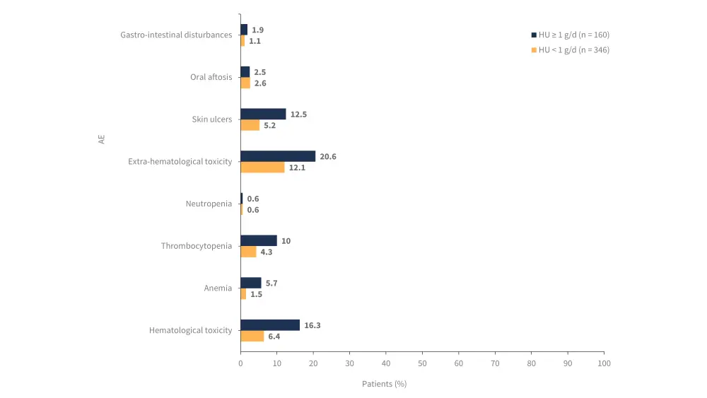 This real-world, retrospective cohort study highlights the importance of optimizing HU dosing. Although higher HU dosing achieves greater rates of CR it also increases the risk of TRAEs. In addition, the study also demonstrates the lack of an association between CR and reduced thrombotic risk. Therefore, HU dosing should be determined based on individual patient needs. Furthermore, a large proportion of stable poor responders continued HU treatment, emphasizing the need to improve overall therapeutic strategy. However, due to the retrospective nature, this study was limited by factors such as patient selection, uncontrolled drug prescription, inadequate recognition of poor response to HU, and inadequate drug compliance assessment.