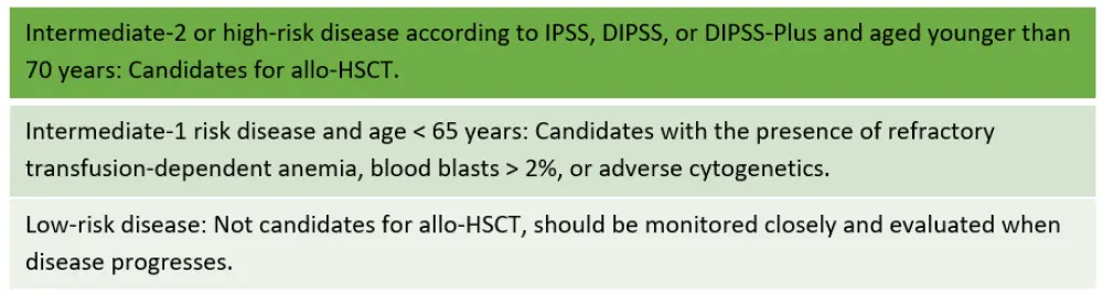 As reported by Kröger, patients in the low and intermediate-1 risk groups seem to have significantly better outcomes with non-transplant therapies; the survival outcome for the intermediate-2 and high-risk group was better with allo-HSCT (p = 0.005 and p = 0.0005, respectively). For more data on survival following allo-HSCT, read here.