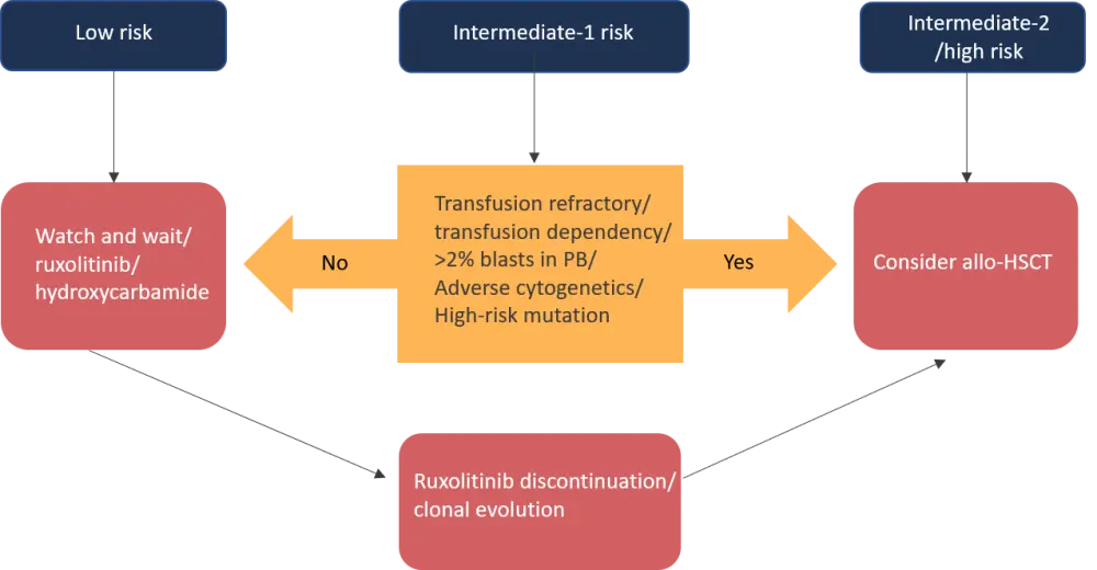 Allogeneic hematopoietic stem cell transplantation (allo-HSCT) offers a curative treatment option for patients with primary MF and secondary MF (including post-essential thrombocythemia [ET]/polycythemia vera [PV]); nevertheless, there is a high risk of mortality and morbidity associated with allo-HSCT. Consequently, it is important to improve patient selection for transplantation.