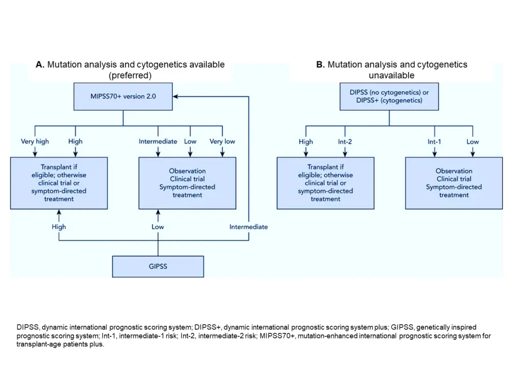 The MIPSS70 includes both clinical and molecular risk factors (Table 1). As the MIPSS70 was specifically designed for the transplant setting, it is therefore age restricted. The MIPSS70 model groups patients into low-, intermediate-, or high-risk categories with a corresponding median OS of 27.7, 7.1, and 2.3 years, respectively. It is also predictive for LFS. The MIPSS70+ incorporates three clinical factors, considers high-risk mutations and karyotype, and places more weight on unfavorable cytogenetic information (Table 1). Recently, MIPSS70+ was updated to MIPSS70 v2.0 with newer genetic findings and differentiation of patients with an unfavorable versus a very high-risk karyotype, adding U2AF1Q157 as a high molecular risk (HMR) mutation (Table 1).