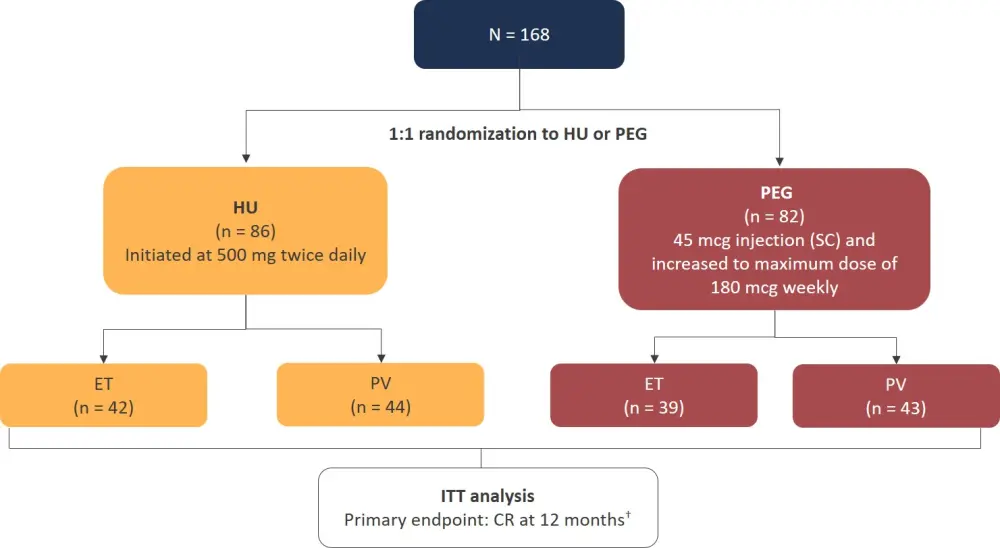 CR, complete response; ET, essential thrombocytopenia; HU, hydroxyurea; ITT, intention-to-treat; PEG, pegylated interferon-alfa-2a; PV, polycythemia vera; SC, subcutaneous.