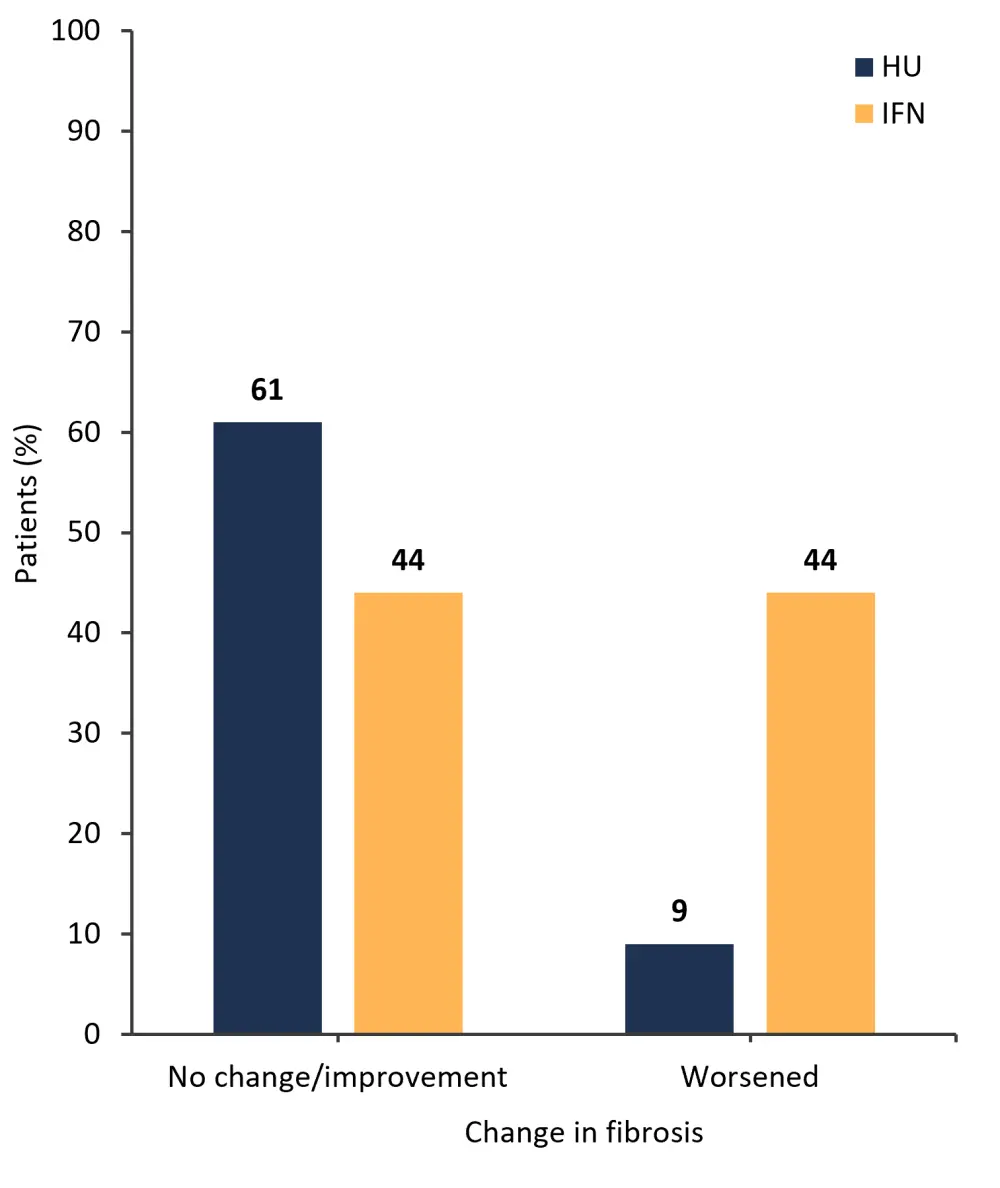The percentage of patients who experienced no change or improvement in bone marrow fibrosis grading was similar with both pegIFNα-2 and HU treatment; however, a higher percentage of patients treated with pegIFNα-2 experienced a worsening of fibrosis (Figure 3).