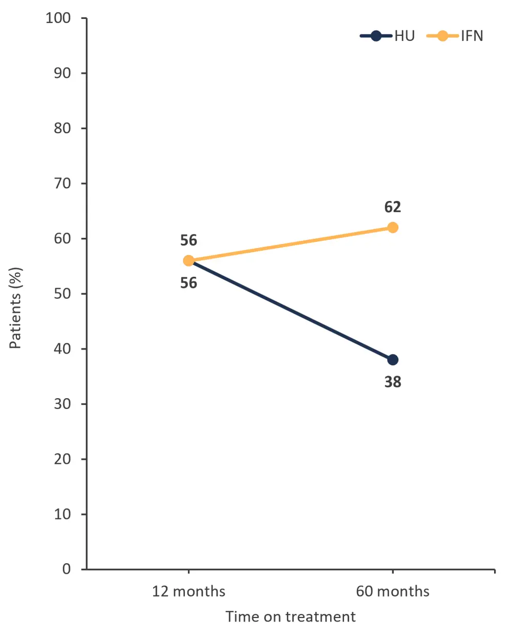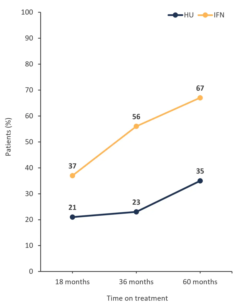 Figure 2. Patients who remained on treatment and experienced a complete hematologic response with either HU or pegIFNα-2*