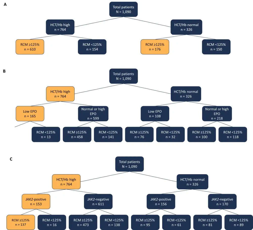 (A) Proportion of patients with true PV (RCM ≥125%) in patients with either a high HCT/Hb or normal HCT/HB. (B) Proportion of patients with true PV (RCM ≥125%) if EPO is the first test performed. (C) Proportion of patients with true PV (RCM ≥125%) if JAK2 mutation is the first test performed.