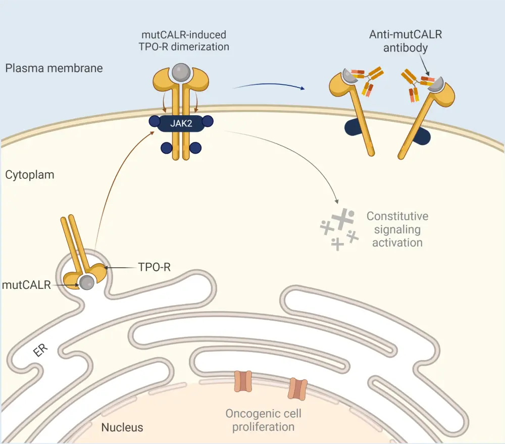 ER, endoplasmic reticulum; JAK2, Janus kinase 2; mutCALR, mutant calreticulin; TPO-R, thrombopoietin receptor.