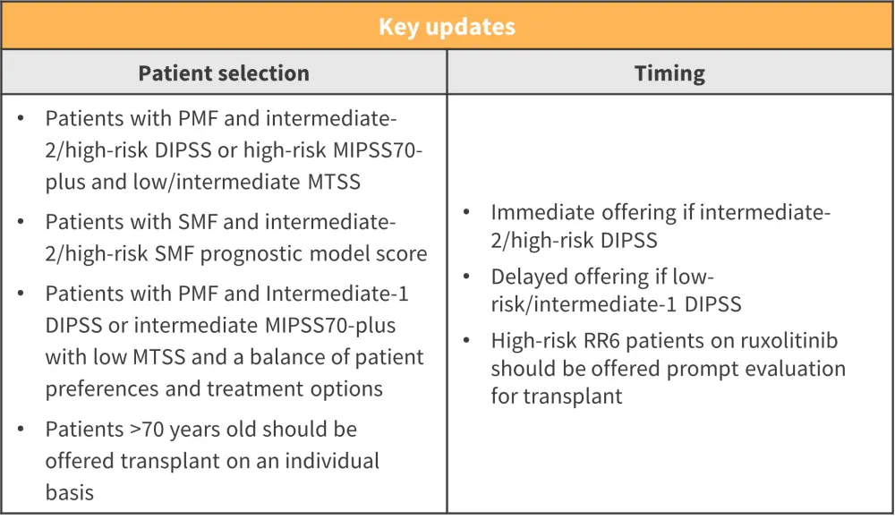 In 2015, the European Group for Blood and Marrow Transplantation (EBMT) and European LeukemiaNet (ELN) co-developed consensus-based guidelines for the indication and management of allogeneic hemopoietic stem cell transplantation (allo-HSCT) in myelofibrosis (MF). Since then, new therapies and combination treatments, improvements in patient/donor selection, conditioning regimens, and posttransplant supportive care have enabled an increased proportion of patients to access the potentially curative option of stem cell transplantation. However, these treatment advances have created new challenges, with the optimal management strategies for MF still unclear. To address this, the EBMT/ELN working group has reviewed data from 2015–2022 and revised the 2015 recommendations to optimize the use of allo-HSCT in patients with MF. Here, we summarize the key updates.