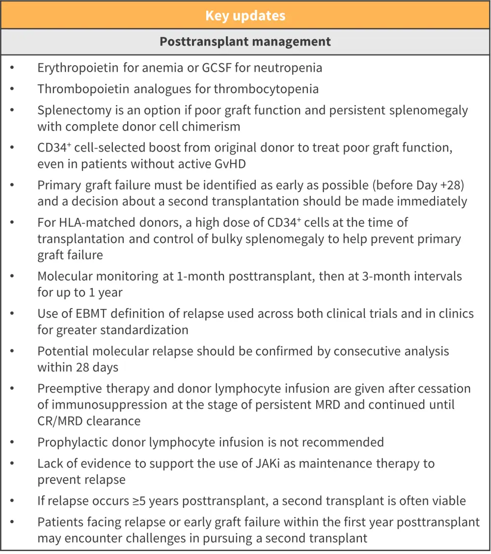 CR, complete remission; EBMT, European Group for Blood and Marrow Transplantation; GCSF, granulocyte colony-stimulating factor; GvHD, graft-versus-host disease; HLA, human leukocyte antigen; JAKi, Janus kinase inhibitor; MRD, measurable residual disease.