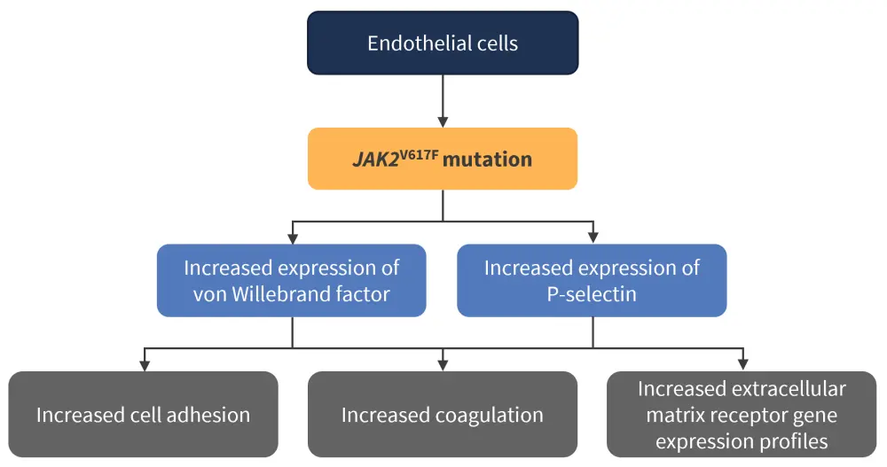 SVTs present as venous thromboembolisms involving the portal, hepatic, splenic, and mesenteric veins.1 Patients diagnosed with MPN have a significantly higher risk of developing SVT compared with a healthy population, and this pathology is often driven by the commonly identified JAK2V617F mutation, which contributes to a procoagulant and pro-adhesive environment.1 In particular, patients with prior SVT have been shown to possess JAK2V617F mutant endothelial cells, which play a critical role in the increase in thrombotic risk (Figure 1).1