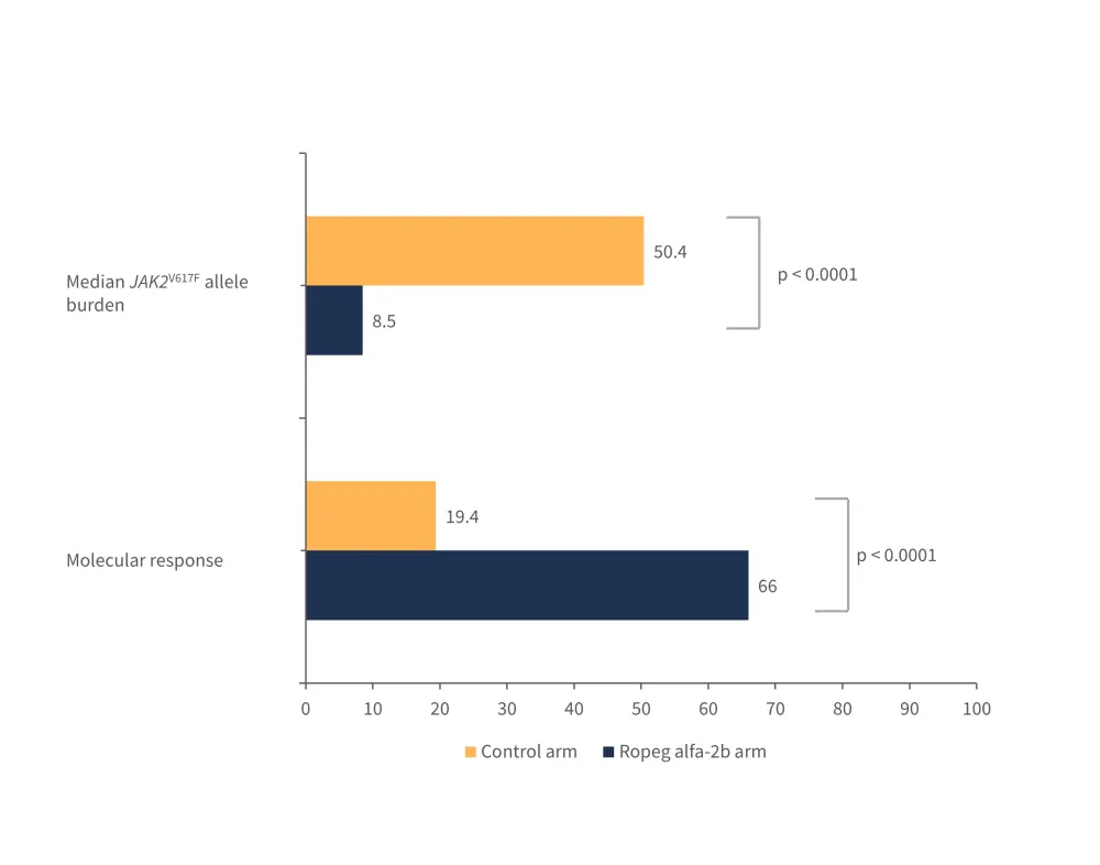 A surrogate endpoint of JAK2V617F allele burden was used as a measure of disease modification. In the ropeginterferon alfa-2b arm, a greater molecular response was observed and a smaller median JAK2V617F allele burden at 6-years (Figure 3).