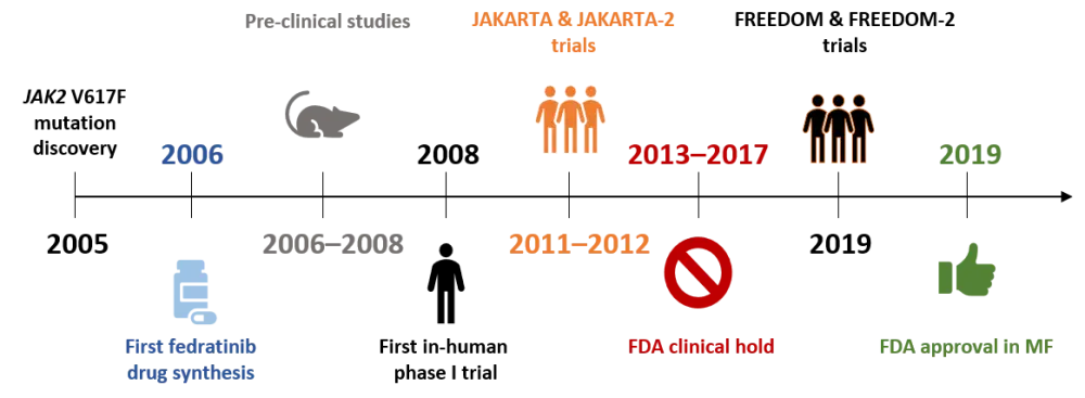 We hereby review the long approval journey of fedratinib, including all the latest analyses from the pivotal JAKARTA and JAKARTA-2 trials that led to its FDA approval, the ongoing fedratinib trials, and its current clinical considerations. This article summarizes the review published in Blood Advances by Ann Mullaly and colleagues,1 and incorporates the updated JAKARTA-2 analysis published by Claire Harrison et al. in the American Journal of Hematology.2