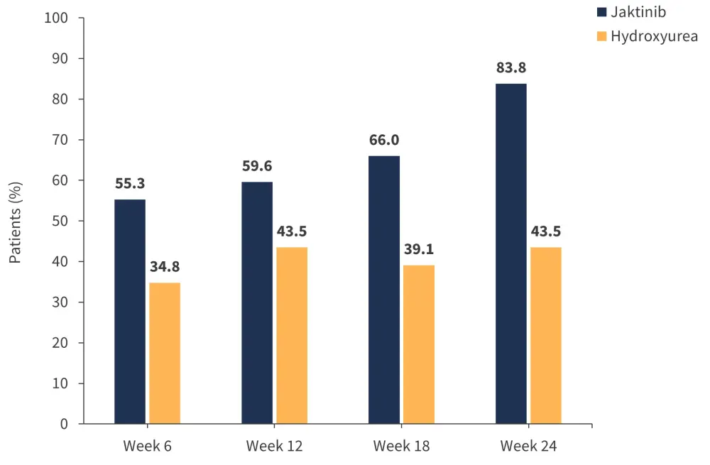 Secondary endpoints included the total symptom score (TSS) response rate in both cohorts, defined as a ≥50% reduction in myeloproliferative neoplasm Symptom Assessment Form (MPN-SAF) TSS from baseline. At Week 24, 55.3% of patients achieved a TSS response rate compared with 34.8% in the HU arm. A summary of TSS response rates is shown in Figure 2.