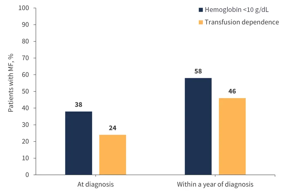Anemia and transfusion dependence affect many patients with MF (Figure 2) and are associated with poor prognosis.6,7 MF-related anemia may be present at the time of MF diagnosis (potentially at severe levels of <8 g/dL hemoglobin) and tends to worsen over time as the disease progresses, or manifest due to JAKi treatment (treatment-related anemia).1