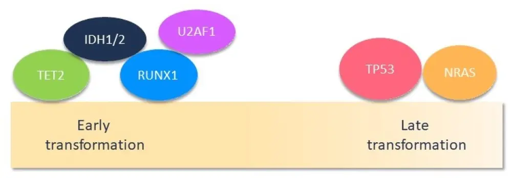 In this study, the authors evaluated not only the presence/absence of mutations at leukemic transformation, but also the allele burden. The findings suggested that mutations that show an increasing allele burden are likely to contribute to the risk of transformation to AML. They identified three molecular groups associated with different time to transformation: