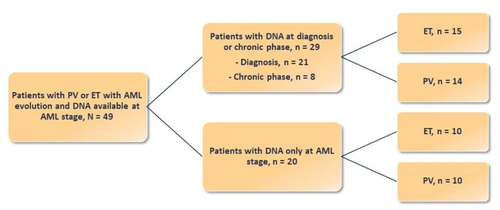 Patients included in the study had previously been diagnosed with PV (n = 24) or ET (n = 25) and showed leukemic evolution. Molecular analyses were performed by next-generation sequencing on DNA samples obtained at the time of leukemic evolution and at diagnosis, or at the chronic phase (the earliest available sample was used if the sample at diagnosis was unavailable; Figure 1). In addition, a control cohort of 80 patients with PV (n = 37) or ET (n = 43) who did not develop AML after ≥ 8 years of follow-up was studied to investigate the prognosis of additional mutations during the chronic phase.