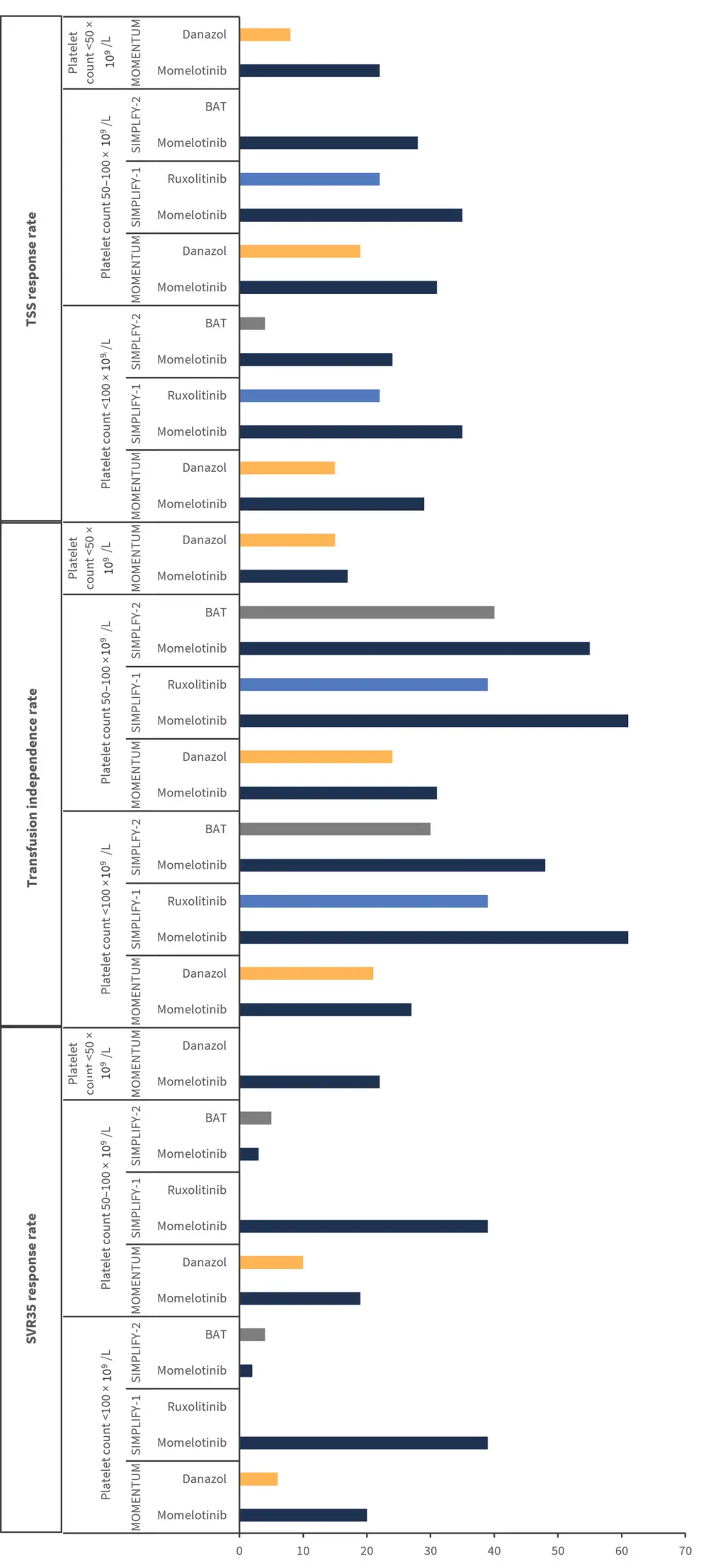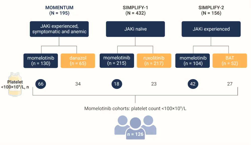 Overall, momelotinib demonstrated a clinical benefit in patients with MF and thrombocytopenia compared with ruxolitinib, danazol, and best available therapy. The safety profile was comparable to the overall population. Notably, this post hoc analysis used trials not initially designed for platelet count subgroup analysis; however, it highlighted the potential of momelotinib as a treatment option for further investigation in patients with MF and thrombocytopenia.