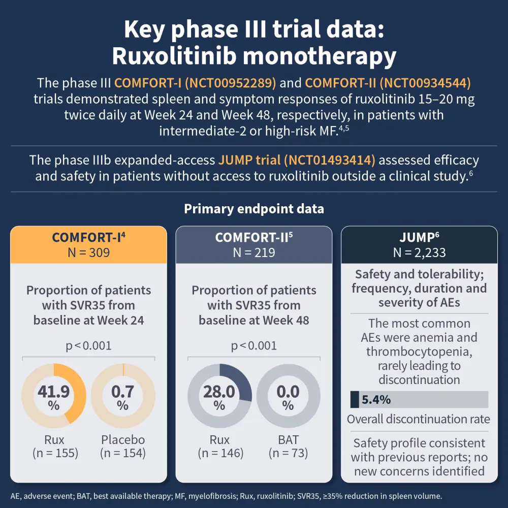 The phase III COMFORT-I (NCT00952289) and COMFORT-II (NCT00934544) trials demonstrated spleen and symptom responses of ruxolitinib 15–20 mg twice daily at Week 24 and Week 48, respectively, in patients with intermediate-2 or high-risk MF.4,5