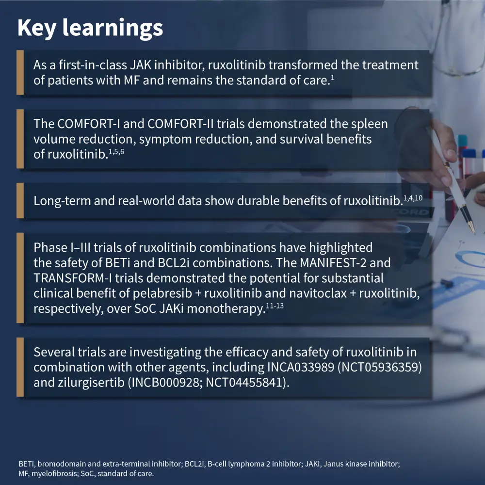 Ruxolitinib, an oral Janus kinase 1/2 (JAK1/JAK2) inhibitor, was first approved by the U.S. Food and Drug Administration (FDA) in 2011 for the treatment of patients with intermediate- or high-risk myelofibrosis (MF), including primary MF, post-polycythemia vera (PV) MF, and post-essential thrombocythemia MF, and remains a mainstay of treatment for these patients.1,2 Ruxolitinib targets primary drivers of MF including constitutive Janus kinase (JAK) and signal transducer and activator of transcription (STAT) pathway activation, thereby regulating inflammatory cytokine signaling and hematopoiesis.1,3