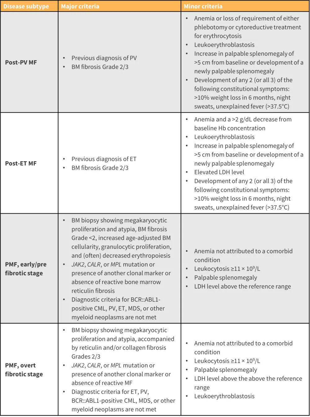 For a confirmed subtype diagnosis, a patient must meet all major criteria defined in the International Consensus Classification, or most of the major criteria together with a minor criterion. Diagnosis should attempt to distinguish MF from other closely related myeloid neoplasms.10