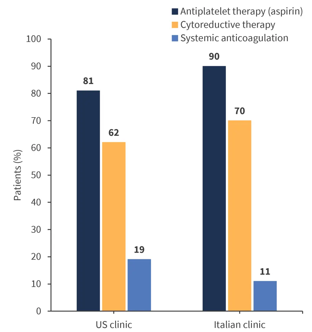 In both centers, initial treatment following diagnosis was comparable. The most common initial treatment in both cohorts was antiplatelet therapy (90%) or specifically aspirin (81%) in the US followed by cytoreductive therapy administered to >50% of patients (Figure 3).