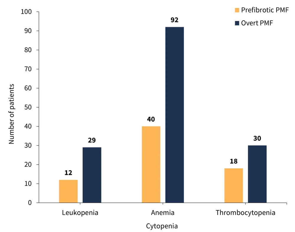 Patients diagnosed with primary myelofibrosis (PMF) commonly experience cytopenias, such as anemia, thrombocytopenia, and leukopenia.1