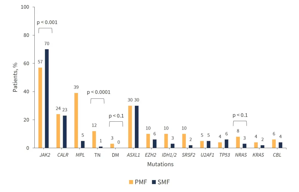 Overall, 62% of patients had JAK2mut, 24% had CALRmut, 5% had MPLmut, 8% were triple-negative, and 2% double-mutated. There were significantly more patients with PMF who were triple-negative compared with patients with SMF (p < 0.0001).