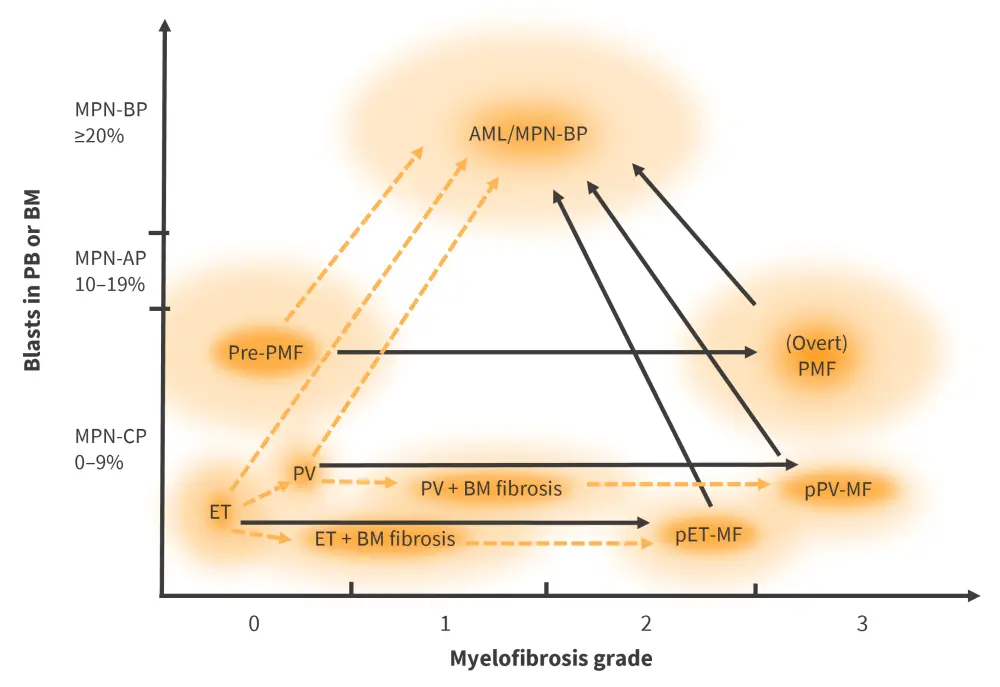 AML, acute myeloid leukemia; BM, bone marrow; ET, essential thrombocythemia; MPN, myeloproliferative neoplasms; MPN-AP, MPN‑accelerated phase; MPN-BP, MPN-blast phase; MPN-CP, MPN-chronic phase; PB, peripheral blood; pET-MF, post-ET myelofibrosis; PMF, primary myelofibrosis; pPV-MF, post-PV myelofibrosis; pre-PMF, prefibrotic primary myelofibrosis; PV, polycythemia vera.