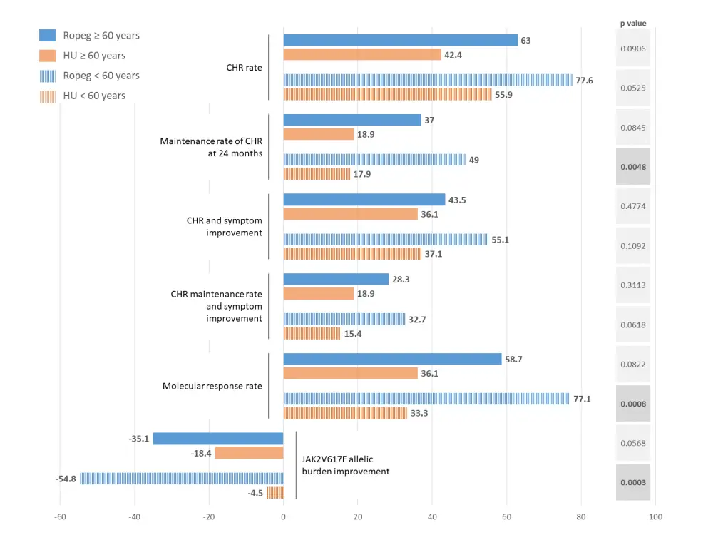 Overall, the study population was considered young, with a median age of 58 years and 59 years in the ropeg and HU arms, respectively. When grouped into < 60 years and ≥ 60 years, age groups were balanced for the most relevant patient characteristics.