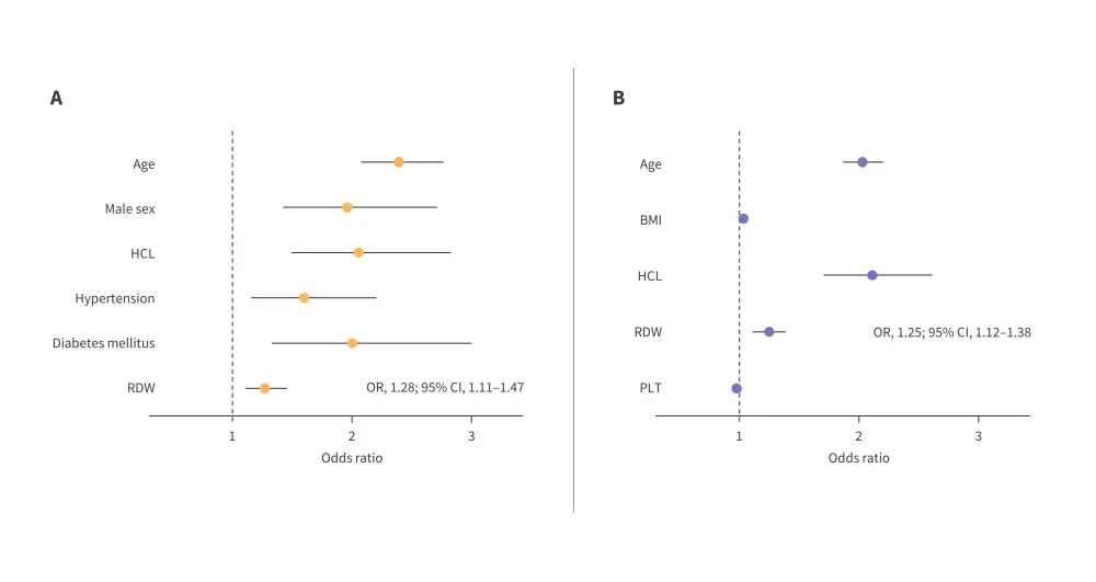 BMI, body mass index; CI, confidence interval; HCL, hypercholesterolemia; OR, odds ratio; PLT, platelet; RDW, red cell distribution width.