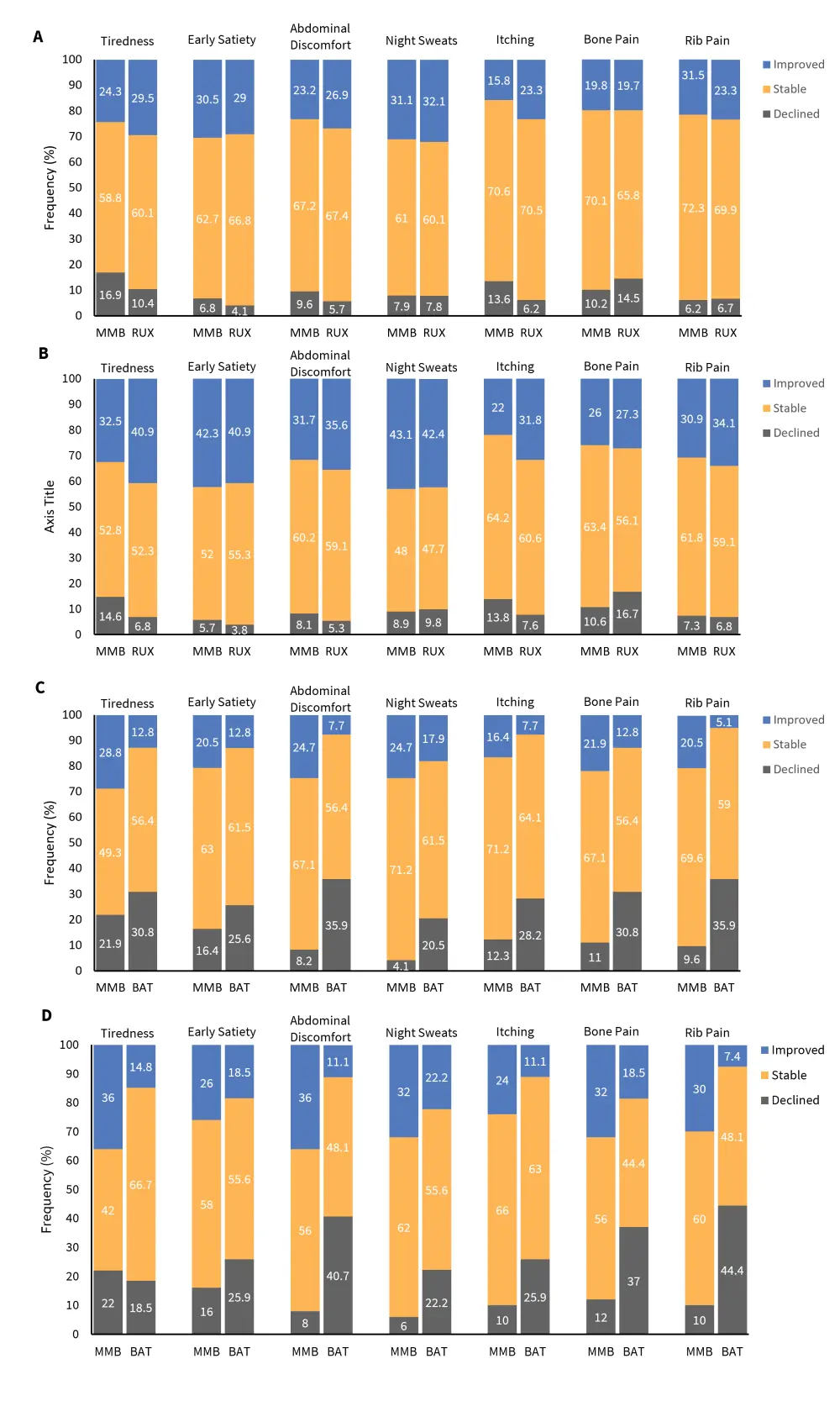 The majority of patients experienced stability or improvement in symptom severity across all groups. In SIMPLIFY-1, the overall population experienced similar rates of symptom improvement in both the momelotinib and ruxolitinib arms. However, in SIMPLIFY-2, the overall and symptomatic populations treated with momelotinib experienced higher symptom improvement and stability rates than patients who received BAT. The frequency of improvement, decline, and stability by individual symptom for each cohort is recorded in Figure 1.