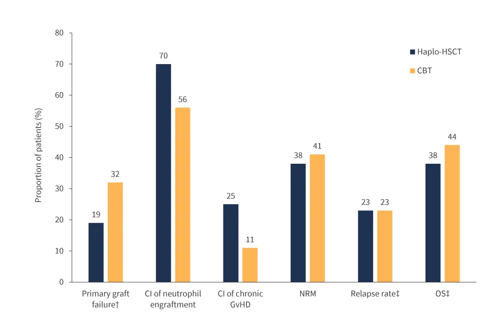 • The median time to neutrophil recovery was longer in CBT recipients compared with haplo-HSCT recipients (27 vs 17 days).