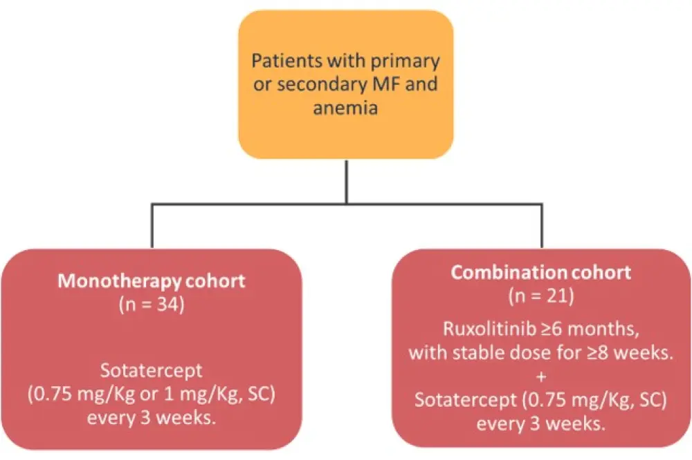 Patients recruited in this study had primary or secondary MF and anemia, and sotatercept was given either as a monotherapy or in combination with ruxolitinib (Figure 2 and Table 4).