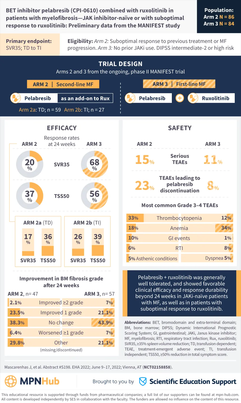During the European Hematology Association (EHA) 2022 Congress, Claire Harrison1 presented the latest results from the ongoing, open-label phase II MANIFEST trial (NCT02158858) investigating pelabresib, a bromodomain and extraterminal (BET) protein inhibitor in myelofibrosis (MF) and essential thrombocytopenia (ET).1 The study comprises four study arms: pelabresib monotherapy in MF and ET (Arms 1 and 4, respectively), pelabresib add-on to ruxolitinib in patients with MF with suboptimal response or MF progression (Arm 2), and pelabresib in combination with ruxolitinib in Janus kinase inhibitor (JAKi)-naïve patients with MF (Arm 3).1