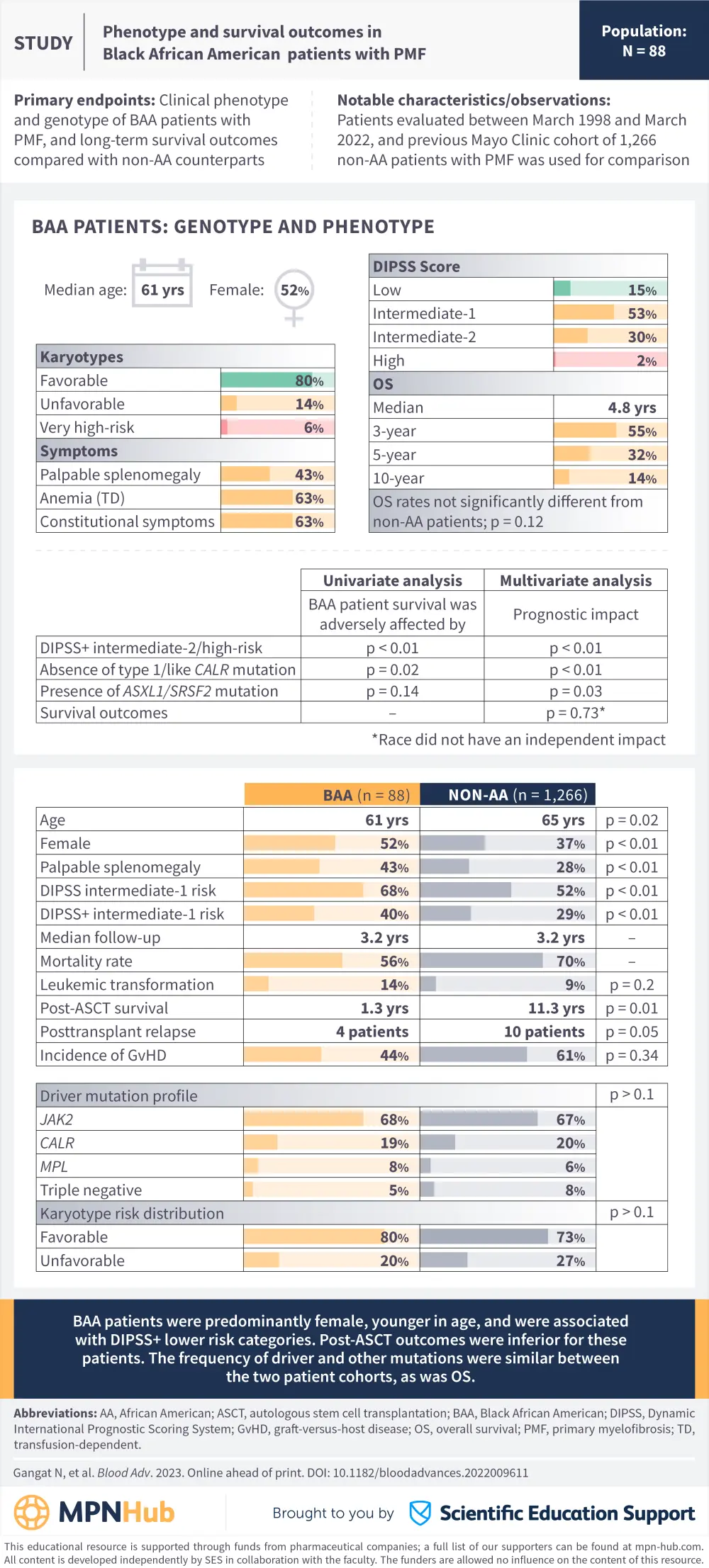 The MPN Hub is pleased to present a visual abstract comparing the clinical genotype, phenotype, and long-term survival outcomes of Black African American patients diagnosed with primary myelofibrosis to their non-African American counterparts. This multicenter, first-of-its-kind study was recently published in Blood Advances by Gangat et al.1
